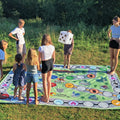 Das große Spielfeld besteht aus einer robusten, wetterfesten Plane – ideal für Wiese, Schulhof oder Sporthalle.